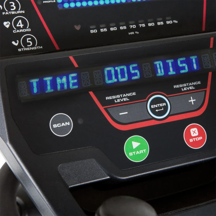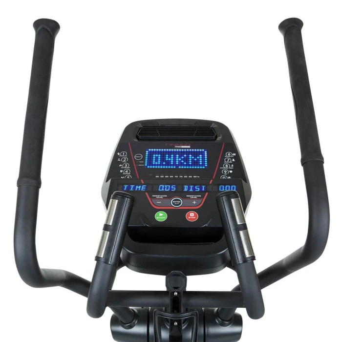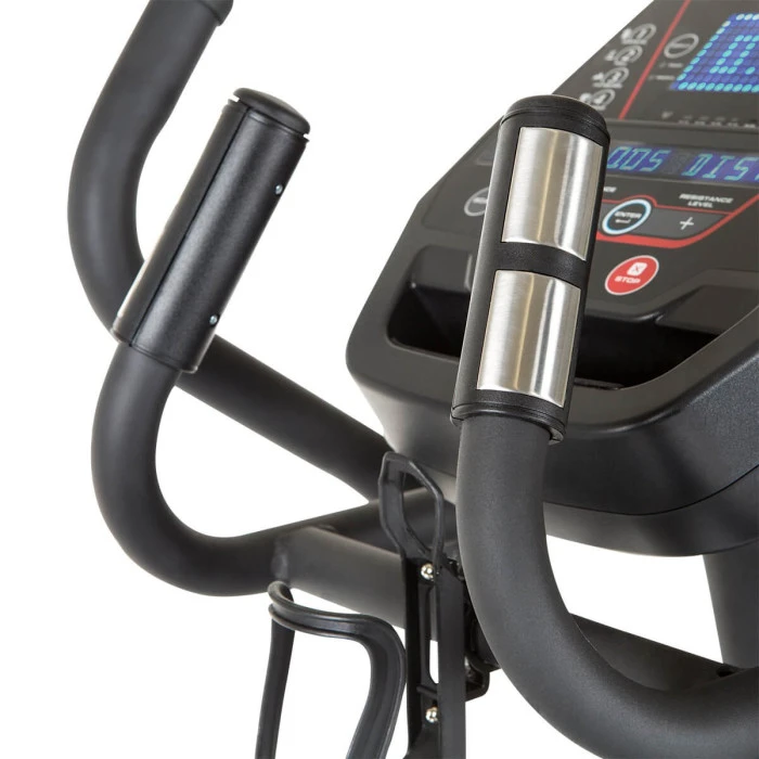 Големият LED дисплей с 24x10 точкова матрица показва ключови данни: време, разстояние, скорост, калории, натоварване, активна програма и пулс. Разполага с 9 фитнес програми и 10 тренировъчни режима, които ти помагат да разнообразиш натоварването. Пулсът се измерва чрез вградени датчици в ръкохватките или чрез гръден колан (по избор) за по-точни резултати.