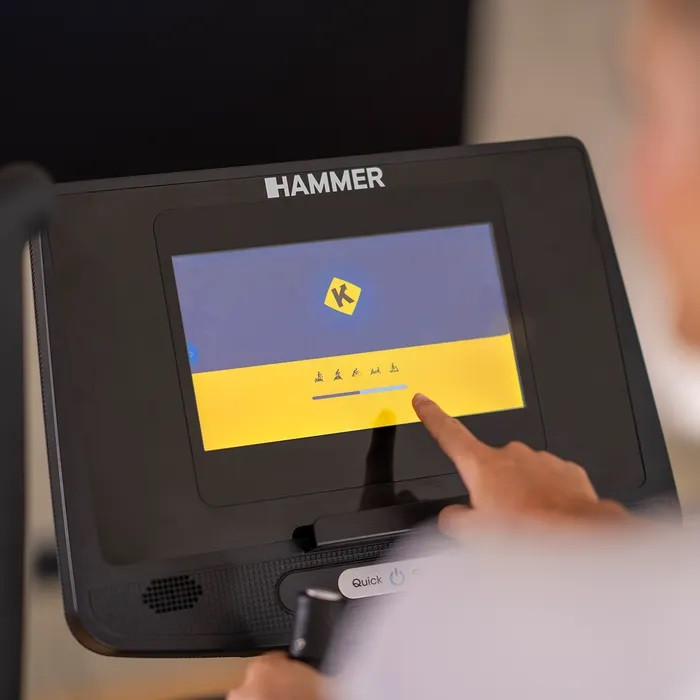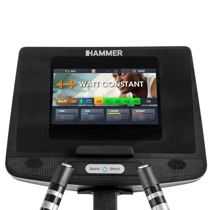 HAMMER Fly RX е полупрофесионален елиптичен тренажор, създаден за потребители, които търсят комбинация от тихо движение, висока стабилност и модерна мултимедийна функционалност. Регулируемата дължина на крачката от 45 до 55 см дава възможност за оптимално напасване към различни ръстове, а малкото разстояние между педалите от 10 см осигурява естествена биомеханика и намалява напрежението върху ставите.