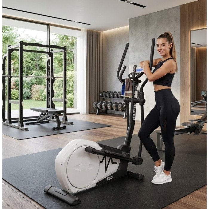Конструкцията издържа потребители до 150 кг, а транспортните колелца улесняват преместването на уреда. С размери 144 × 74 × 161 см и тегло 49 кг, MASTER E50 е стабилен кардио уред, подходящ за редовни тренировки в домашни условия.