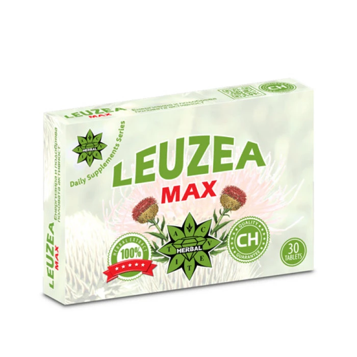 Leuzea MAX съдържа екстракт от левзея, която е енергизиращ агент. Стимулира либидото, повишава половата активност и потентността, подпомага репродукцията. Облекчава стреса със своите адаптогенни способности. Начин на приемане: 1 таблетка на ден.