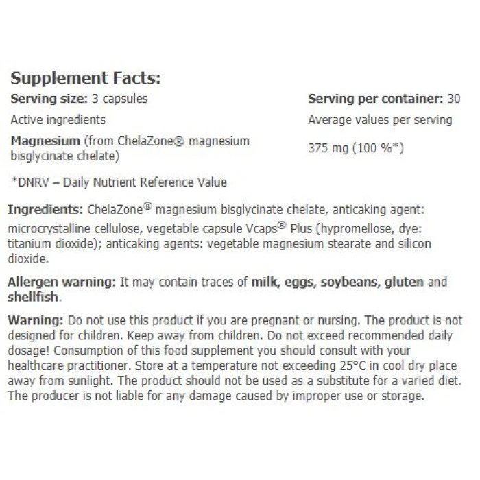 AMIX ChelaZone® MagneChel® е хранителна добавка с уникална формула, базирана на магнезиев бисглицинат хелат. Една от най-добрите и лесно усвоими форми на магнезий – само и единствено високо качество за вашето здраве. Идва в капсули с растителен произход, което прави продукта подходящ за вегани и вегетарианци. AMIX ChelaZone® MagneChel® е натурален продукт, който чрез своето бързо и ефикасно усвояване доставя на тялото нужния дневен прием! Магнезият е четвъртият най-разпространен минерал в човешкото тяло. Участва в производството на енергия, поправянето на ДНК и протеиновия синтез. Подпомага нормалното функциониране на нервната система и регулира активността на невротрансмитерите. Грижи се за мускулатурата и костната система като дори може да подобри представянето по време на тренировки. Намалява умората и предотвратява пълното изтощение. Една доза: 3 капсули Дози в опаковка: 30 Начин на приемане: Приемайте 1 доза на ден с храна и вода Съставки: ChelaZone® магнезиев бисглицинат хелат, средство против слепване: микрокристална целулоза, растителна капсула Vcaps® Plus (хипромелоза, багрило: титанов диоксид); средства против слепване: растителен магнезиев стеарат и силициев диоксид. Забележки: Не превишавайте препоръчителния дневен прием! Не използвайте като заместител на разнообразното хранене! Cъxpaнявaйтe нa cyxo и xлaднo мяcтo! Поръчай сега от Спортен склад БГ AMIX ChelaZone® MagneChel® Magnesium Bisglycinate Chelate / 90 Vcaps с експресна доставка!