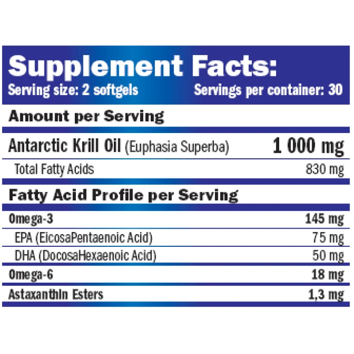 Krill Oil от AMIX е продукт, чиято формула снабдява организма с незаменимите омега-3 и омега-6 мазнини, извлечени от висококачественото масло от крил. То е доказано по-лесно усвоимо от организма и по-ефективно от рибеното като притежава силни противовъзпалителни свойства. Добавката видимо облекчава артритни заболявания без да причинява странични ефекти. Маслото от крил в Krill Oil от AMIX е също така доказан антиоксидант, който защитава тялото от дейността на свободните радикали. То е имуностимулант, богат на ейкозапентаеновата киселина (ЕРА )и докозахексаеновата киселина (ДНА), които благоприятстват на сърдечната функция. Докозахексаеновата киселина ДНА стимулира мозъчната функция и действа като первантивна мярка срещу загубата на памет и липсата на концентрация. Погрижете се за организма си като поръчате Krill Oil от AMIX още днес! Една доза: 2 капсули Препоръчителен прием: 2 капсули дневно, с храна Дози в опаковка : 60 Забележки: Може да съдържа следи от мляко, соя, яйца, глутен, фъстъци или ядки Продуктът не е предназначен за деца, бременни жени или кърмачки! Съхранявайте на стайна температура от 25˚С далеч от пряка слънчева светлина! Да не се използва като заместител на разнообразното хранене!