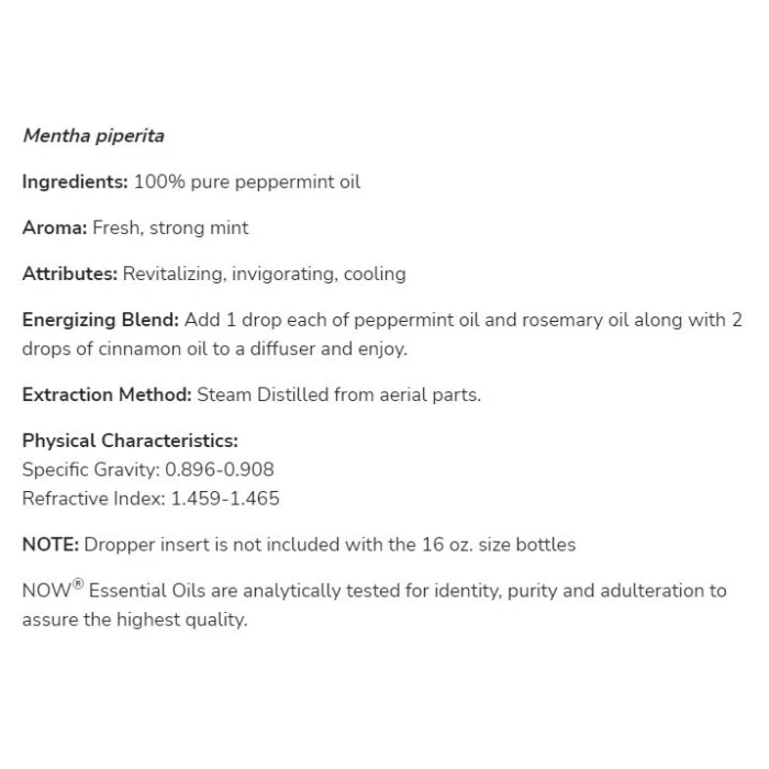 Масло от мента NOW Peppermint Oil имa cвeж apoмaт, ĸoйтo въздeйcтвa нa yмcтвeнaтa дeйнocт, xpaнocмилaнeтo и дeйcтвa oxлaждaщo.