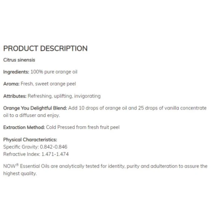Масло от портокал NOW Orange Oi е висококачествено студено пресовано есенциално масло от, което подобрява настроението и намалява стреса. Функции и характеристики: