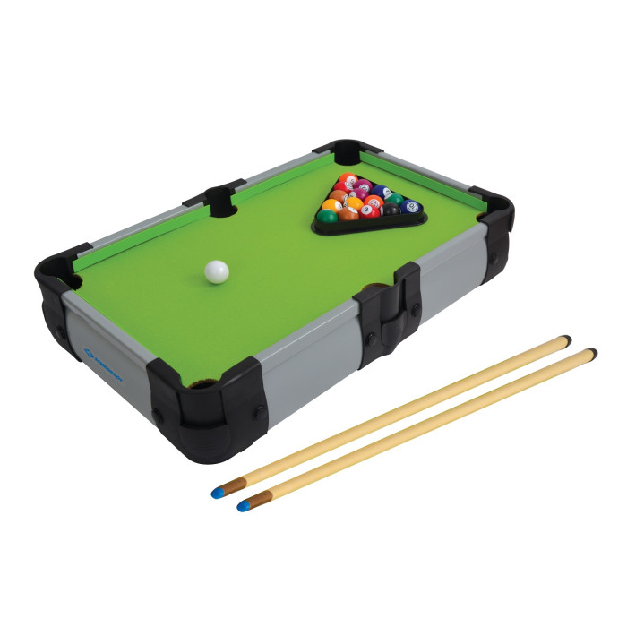 Комплектът включва всичко необходимо за игра – 16 топчета, 2 щеки и триъгълник за подреждане, което позволява да започнеш веднага. Пластмасовите джобове с плъзгащ механизъм осигуряват плавно падане на топчетата и добавят удобство по време на игра.