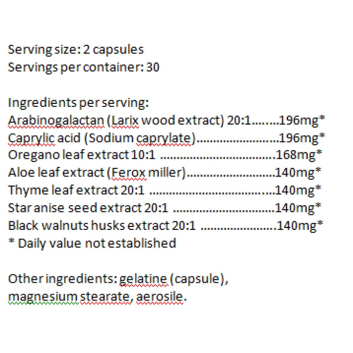 Семе Анасон екстракт Съдържа етерично масло с главна съставка анетол; други съставки са метилхавикол, анизалдехид, анизкетон и анозова киселина. Анасонът е богат на масло (8-28%), белтъчни вещества (до 30%), слузни вещества и около 10% минерални соли Каприлова киселина Подържа пълноценното усвояване на храната поради способността си да въздейства върху здравословния баланс на чревната флора. Намалява процесите на ферментация, образувани от неблагоприятните за храносмилателната система гъбични образувания. Има силни алкализиращи свойства и неутрализира излишните киселини в тялото Риган екстракт Възпрепятства пагубното за клетките окисление. Притежава способността да забавя клетъчното стареене. Риганът е богат на флавоноиди, които са отлични антиоксиданти Арабиногалактан Счита се за пребиотик. Чревната флора предизвика ферментация на неабсорбиращите се фибри, което води до по-голяма продукция на късоверижни мастни киселини. Те са много важни за здравето на дебелото черво и са основен енергиен източник за епителните клетки в него. Арабиногалактан инхибира или блокира лецитин рецепторите и е два пъти по-мощен имуностимулант от ехинацеята Обелки от Черен орех екстракт С висока концентрация на танини, които редуцират болката и подуването, борят се с инфекциите, както и с различни видове паразити. Имат антимикотичен ефект, подходящ при антибиотично лечение за възстановяване на нормалната чревна флора. Участват активно в процесите на регулация на киселинността в клетките и по този начин поддържат нормални нива на алкалност в тялото Една доза: 2 капсули Дози в опаковка: 30 Начин на употреба: 1 доза дневно, преди хранене с достатъчно количество вода Съставки: екстракт от мащерка, екстракт от алое вера, екстракт от семе анасон, каприлова киселина, екстракт от риган, арабиногалактан, екстракт от обелки черен орех Забележки: Пазете далеч от деца! Съхранявайте на сухо и хладно място! Поръчай сега от Спортен склад БГ BIOTICA PH Modulator 560mg / 60Caps. с експресна доставка!