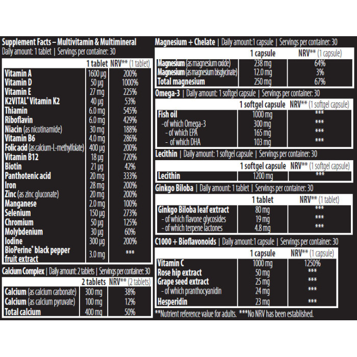 Съставки: витамин А, витамн В1, витамин В3, витамин В5, витамин В6. витамин В12, витамин В9, витамин С, витамин D, калций, магнезий, желязо, цинк, рибено масло, екстракт от гроздово семе, лутеин, рутин
