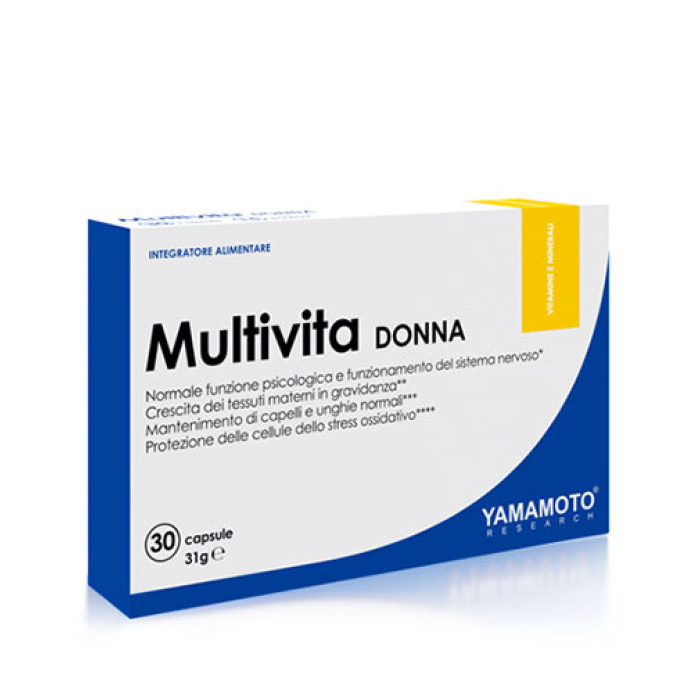 Yamamoto ® Research Multivita DONNA е комплексна добавка, съдържаща витамини, минерали и други хранителни елементи, създадени специално за жени от всички възрасти. Суплементът е източник на витамини В1, В12 и ниацин, които поддържат нормалната работа на нервната система и се грижат за психическото състояние. Витамините от B-комплекс се използват за регулиране нивата на хомоцистеин в кръвта, като така се оказва протективно действие срещу увреждане на нервната и сърдечно-съдовата системи.