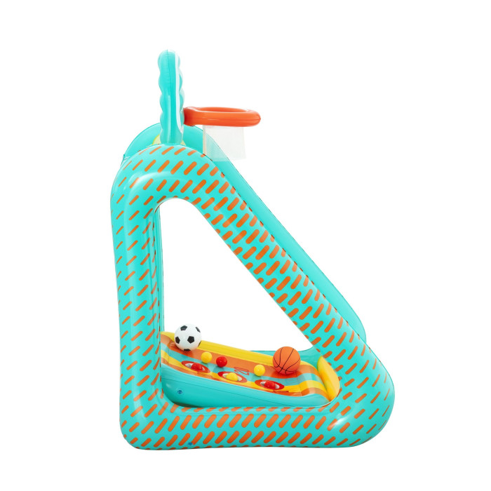 СТАБИЛНА И ПРАКТИЧНА ЗА ИГРА НАВЪН В задната част има водна камера, която служи като тежест и помага мишената да стои по-стабилно по време на игра. Лепкавата зона отпред улеснява отчитането на попаденията, а включените топка с помпа и 6 цветни топки позволяват играта да започне веднага. Това е практична надуваема игра за деца над 5 години, която събира футбол, баскетбол и игра на точност в едно компактно решение за двора.