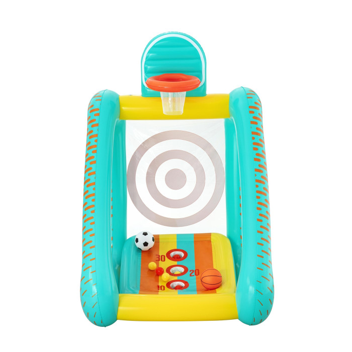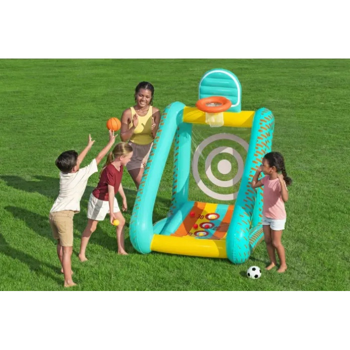 ПОВЕЧЕ ИГРИ В ЕДНА НАДУВАЕМА ЦЕЛ BESTWAY Perfect Aim 3-In-1 е надуваема мишена за двор, която дава няколко различни начина за игра в един продукт. Детето може да рита или хвърля към основната мишена, да опитва попадения в номерираните отвори или да играе с малкия баскетболен кош. Това прави модела много подходящ за по-дълга игра, защото не омръзва бързо и предлага различни занимания според възрастта и интереса.