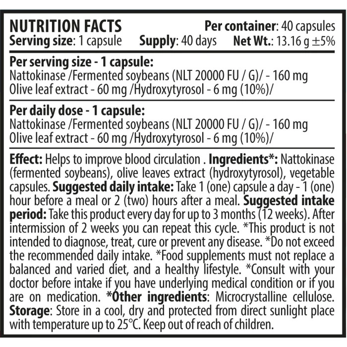 CVETITA HERBAL Natto MAX 160 mg / 40 Caps съдържа натокиназа, извличаща се от ферментирали соеви зърна и представляваща ензим, който подобрява кръвообращението и се грижи за правилното функциониране на сърдечно-съдовата система. Това влияе положително върху кръвосъсирването и действа превантивно срещу образуването на съсиреци в кръвоносните съдове. Формулата на CVETITA HERBAL Natto MAX 160 mg / 40 Caps покрепя правилното функциониране на сърдечно-съдовата система и балансира нивата на кръвното налягане. Освен това намалява концентрацията на липиди в кръвта, като по този начин може да намали риска от развитие на атеросклероза. CVETITA HERBAL Natto MAX 160 mg / 40 Caps влияе положително върху храносмилането и намалява неприятните симптоми на чревно неразположение, като диария, газове и подуване. Една Доза: 1 таблетка Начин на приемане: Приемайте по 1 таблетка, веднъж дневно. Дози в опаковка: 40 Вземи още сега с гарантирано качество от Спортен склад БГ! Съставки: Натокиназа (ферментирали соеви зърна), маслинови листа екстракт (хидрокситирозол), растителни капсули Забележки: Пазете далеч от деца. Съхранявайте на сухо и хладно място. Да не се използва като заместител на разнообразното хранене. Поръчай сега от Спортен склад БГ CVETITA HERBAL Natto MAX 160 mg / 40 Caps с експресна доставка!