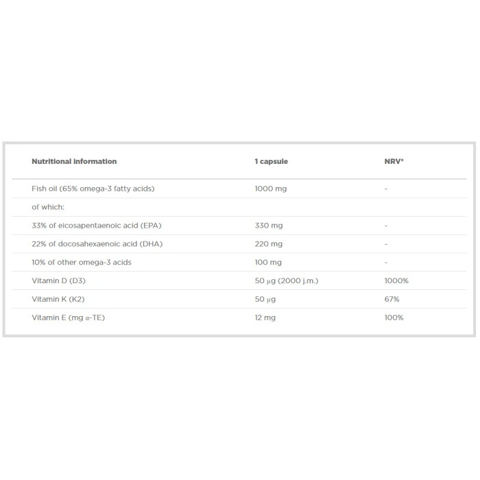 Gold Omega 3 D3 + K2е с високо съдържание на омега-3, витамини D3 и K2. Премиално фино концентрирано студеноводно рибено масло с 65% стандартизирано съдържание на омега-3 мастни киселини, допълващи диетата с есенциални омега-3 мастни киселини. Gold Omega 3 D3 + K2 също съдържа високо количество естествен витамин К от натто, който се отличава в най-смилаемата си и активна форма - менахинон-7 (витамин К2). Омега-3 EPA (ейкозапентаенова киселина) и DHA (докозахексаенова киселина) в Gold Omega 3 D3 + K2 допринасят за правилното функциониране на сърцето, витамините D и К спомагат за поддържането на правилното функциониране на сърдечно-съдовата система: Витамин К допринася за нормалната коагулация на кръвта; Витамин D помага за поддържане на нормални нива на калций в кръвта. Той също играе роля за поддържането на здрави кости и зъби, допринася за правилното усвояване на калций и фосфор, осигурява правилното функциониране на имунната система. Една доза =1 капсула Начин на приемане:1 доза дневно след хранене, приета с повече вода Дози в опаковка:60 Съставки: Рибено масло (65% омега-3 мастни киселини), от които: 33% ейкозапентаенова киселина (EPA), 22% докозахексаенова киселина (DHA), 10% от другите омега-3 киселини, Витамин D (D3 2000 jm) Витамин К (К2) Витамин Е (mg α-TE). Забележки: Не превишавайте препоръчителния дневен прием! Да не се използва като заместител на разнообразното хранене! Поръчай сега от Спортен склад БГ OLIMP Gold Omega 3 D3 + K2 Sport Edition / 60 Caps с експресна доставка!