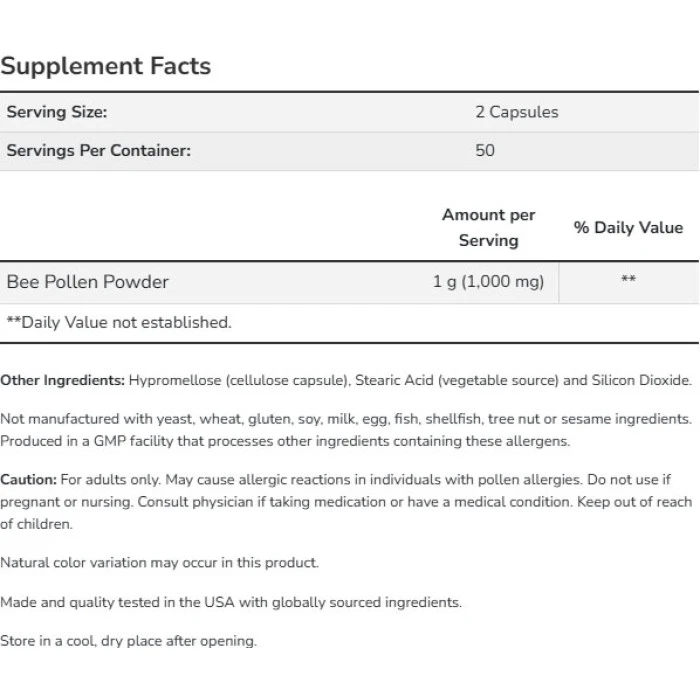 NOW Bee Pollen предоставя всички естествени хранителни вещества, като при истински здравословната храна. Пчелният прашец е фин прах, който представлява мъжкият елемент на цветето. Медоносните пчели, събиращи прашеца, инстинктивно вземат само чистия и здравословен прашец. След това той е смесен с цветен нектар и слюнката на пчелите, за да образува една напълно естествена, високо питателна храна, която съдържа всички двадесет и два елемента, изграждащи човешкото тяло. Доставя витамини, аминокиселини, макроелементи и ензими в една балансирана и синергична комбинация, която предоставя оптималното от биоразнообразието. Препоръчителна употреба на NOW Bee Pollen: Като хранителна добавка, приемайте 2 капсули 1 до 3 пъти дневно, за предпочитане по време на хранене. Подходящ в комбинация с Spirulina, Lacithin CoQ10 на NOW.
