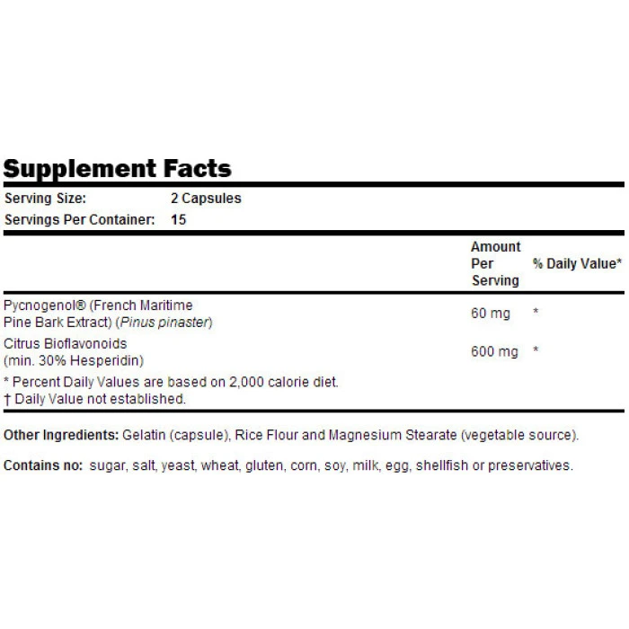 Pycnogenol е особено подходящ за хора, страдащи от диабет. Продуктът не съдържа захар, сол, мая, пшеница, глутен, царевица, соя, мляко, яйца, ракообразни и консерванти. Препоръчителен дневен прием: Приемайте по 2 капсули от 1 - 3 пъти дневно.
