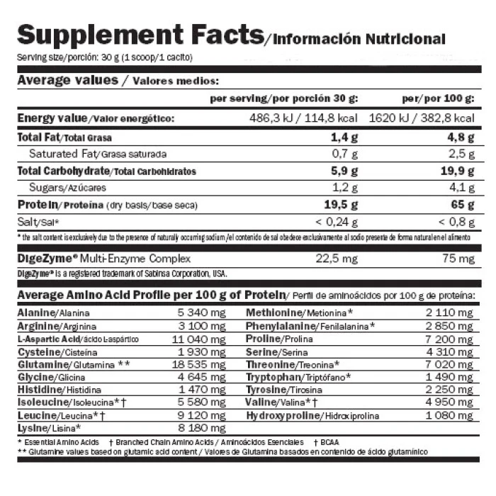 Опаковка: 4кг Съставки: ултрафилтриран суроватъчен протеин концентрат, аминокиселини, получени от телешки протеин изолат, малтодекстрин, какао на прах, стабилизатори: ксантан и гума гуар; емулгатор: соев лецитин, аромат, подсладители: сукралоза SPLENDA® и ацесулфам-K; оцветител: (аромат на банан - куркумин, ягода и горски плодове аромат - екстракт от червено цвекло, ябълки и канела - тартразин и патент синьо V); патентован храносмилателен ензим DigeZyme® - мулти-ензимен комплекс (амилаза, липаза, лактаза, целулаза, бактериална неутрална протеаза) Забележки: Да не се превишава дневната препоръчителна доза! Да не се използва като заместител на разнообразното хранене! Да се съхранява при температура под 25 ° C на хладно и сухо място, далеч от пряка слънчева светлина.