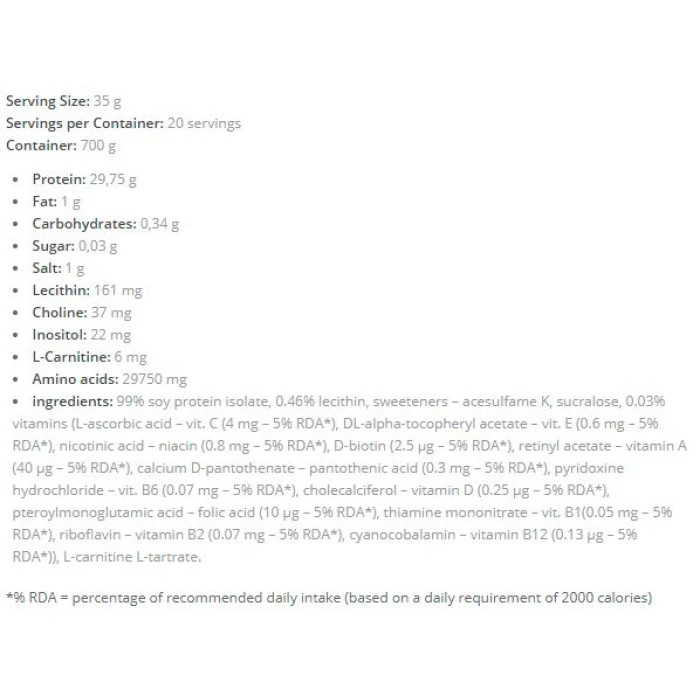 OLIMP Sojavit 85 е висококачествен соев протеин, който е подходящ за всички които не консумират животински продукти. Соевият протеинов изолат на прах съдържа много малко мазнини и никакъв холестерол. За разлика от повечето други растителни протеини, той е пълноценен протеин. Това означава, че съдържа всички основни аминокиселини, които тялото не може да произведе и трябва да получи от храната. Докато всяка аминокиселина играе роля в синтеза на мускулни протеини, аминокиселините с разклонена верига (BCAA) са най-важните, когато става въпрос за изграждане на мускули. OLIMP Sojavit 85 стимулира качването на чиста мускулна маса и ускорява възстановяването след тренировка. Произведен е от изцяло растителни съставки и не съдържа ГМО. Освен това е с високо съдържание на белтъчини. Една Доза: 1 мерителна лъжица (35 грама) Начин на приемане: Смесете една доза от продукта в 285мл вода и консумирайте максимум 3 пъти дневно Дози в опаковка: 20 Вземи още сега с гарантирано качество от Спортен склад БГ! Съставки: 99% соев протеинов изолат, 0,46% соев лецитин, подсладители - ацесулфам К, сукралоза, цикламати; 0,03% витамини (L-аскорбинова киселина - вит. С, DL-алфа-токоферилацетат - вит. Е, никотинамид - ниацин, D-биотин, ретинилацетат - вит. А, калциев D-пантотенат - пантотенова киселина, пиридоксин хидрохлорид - вит. B6, холекалциферол - вит. D, птероилмоноглутаминова киселина - фолат, тиамин мононитрат - вит. B1, рибофлавин - вит. B2, цианокобаламин - вит. B12), 0,03% L-карнитин-L-тартарат Забележки: Пазете далеч от деца. Съхранявайте на сухо и хладно място. Да не се използва като заместител на разнообразното хранене. Поръчай сега от Спортен склад БГ OLIMP Sojavit 85 с експресна доставка!