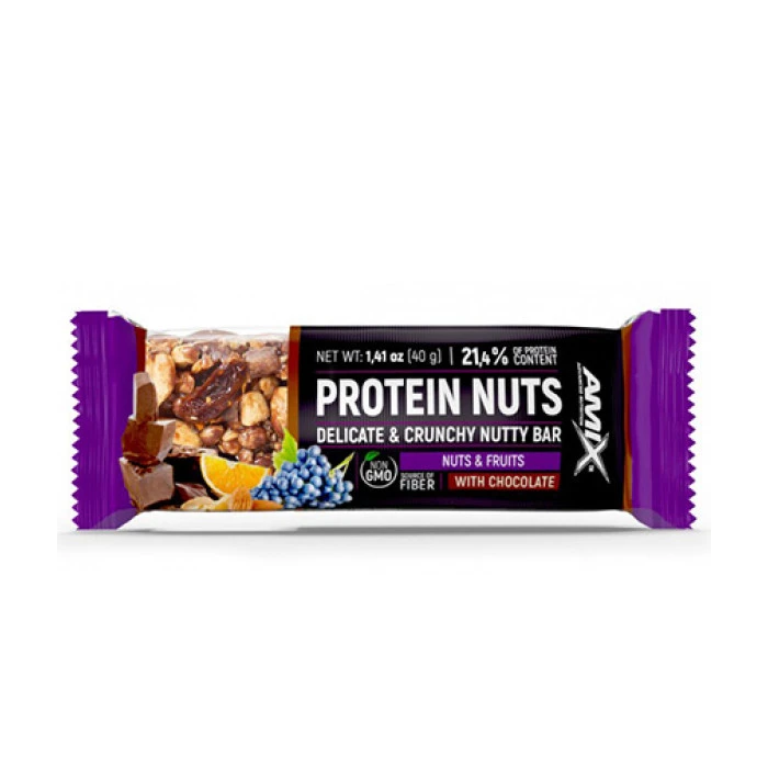 AMIX Protein Nuts Crunchy Nutty Bar / 40g е чудесно решение за всеки ден. Ако се случи така, че нямате възможност да се нахраните както обикновено, може спокойно да разчитате на него. С високото си съдържание на протеини и въглехидрати, Protein Nuts Crunchy Nutty Bar не оставя шанс на глада. Засища чудесно, при това е толкова здравословен. В състава му са включени специално подбрани видове ядки, залети с вкусен школад, което го превръща и в идеалния десерт за спортисти и всички, които искат да се хранят здравословно. Заради това, че подсигурява на организма над 21% от необходимия протеин, вкусният бар е отлична възможност за подпомагане натрупването на мускулна маса и възстановяване силите на организма. Една доза: 1 бар Начин на приемане: Препоръчва се по 1 бар дневно – винаги, когато имате нужда от повече сили и енергия или просто ви се хапва нещо сладко. Дози в опаковка: 1 доза Вкус: 4 страхотни вкуса - ядки и плодове, бадеми и тиквено семе, кокос и кашу, фъстъци и карамел Съставки: ядки, шоколад 1 бар има: 12,6 гр мазнини 12,7 гр въглехидрати 6 гр захар 9,1 гр протеин Забележки: Не употребявайте продукта при непоносимост към някоя от съставките. Съчетавайте с балансирана диета и упражнения. Да се съхранява на място, недостъпно за деца. Поръчай сега от Спортен склад БГ AMIX Protein Nuts Crunchy Nutty Bar / 40g с експресна доставка!