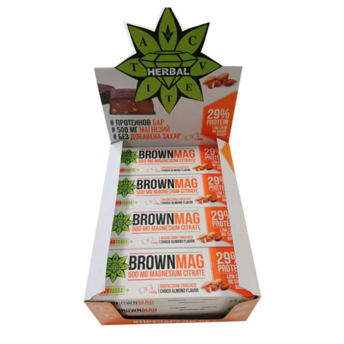CVETITA HERBAL BrownMag Bar Almond е не само много вкусен, но и изключително полезен протеинов десерт, с чиято помощ ще рестартирате организма си и ще подобрите значително неговите най-важни функции. Той съдържа много ценни съставки, които ще ви помогнат да засилите имунитета си, ще подобрят сърдечната ви дейност, както и ще заздравят костите и зъбите ви. Обогатен с естествени подсладители, които не съдържат калории и са абсолютно безвредни. Една доза: 1 брой - 60 гр. Начин на приемане: Препоръчва се от 1 до 2 протеинови бара на ден – като десерт или между храненията. Дози в опаковка: 12 Вкус: Шоколад и бадем Съставки: Протеин (млечен протеин концентрат,суроватъчен протеин концентрат), кокосово масло, магнезиев цитрат, какаова маса, нискомаслено какао на прах; емулгатор: соев лецитин,какаово покритие (нехидрогенирано растително палмово масло; подсладители: малтитол,ароматизант: ванилин); подсладители: сорбитол, еритритол; какаова маса, еритритол; смлени фъстъци 9%, малтитол, нискомаслено какао на прах; емулгатор: соев лецитин, натрошени фъстъци 18%. Забележки: Да не се превишава препоръчителната дневна доза, поради възможен слабителен ефект. Тази хранителна добавка не следва да замества балансираната, разнообразна диета и здравословния начин на живот. Поръчай сега от Спортен склад БГ CVETITA HERBAL BrownMag Bar Almond Box / 12x60g с експресна доставка!