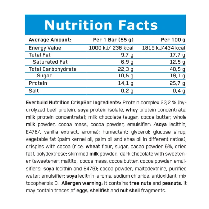 Everbuild crisp bar box / 15 x 55g е супер вкусен протеинов бар, който е създаден по иновативна формула, с най-висок клас съставки! Този протеинов десерт съдържа минимално количество мазнини и захари, обогатен е с протеинов комплекс - хидролизиран телешки протеин, соев протеин, суроватъчен протеин изолат и суроватъчен протеин концентрат. Everbuild crisp bar box / 15 x 55g е създаден специално за всеки активно спортуващ човек, който има нужда от максимално количество белтъчини, за да покачи мускулната си маса, и едновременно с това да не се притеснява за скритите цифри в етикета - тук те са минимални в графите мазнини и захари! Everbuild crisp bar box / 15 x 55g идва в 2 страхотни вкуса и е пълен с хрупкави шоколадови топчета, които ще заситят вкуса и на най-капризните. Вкусове: