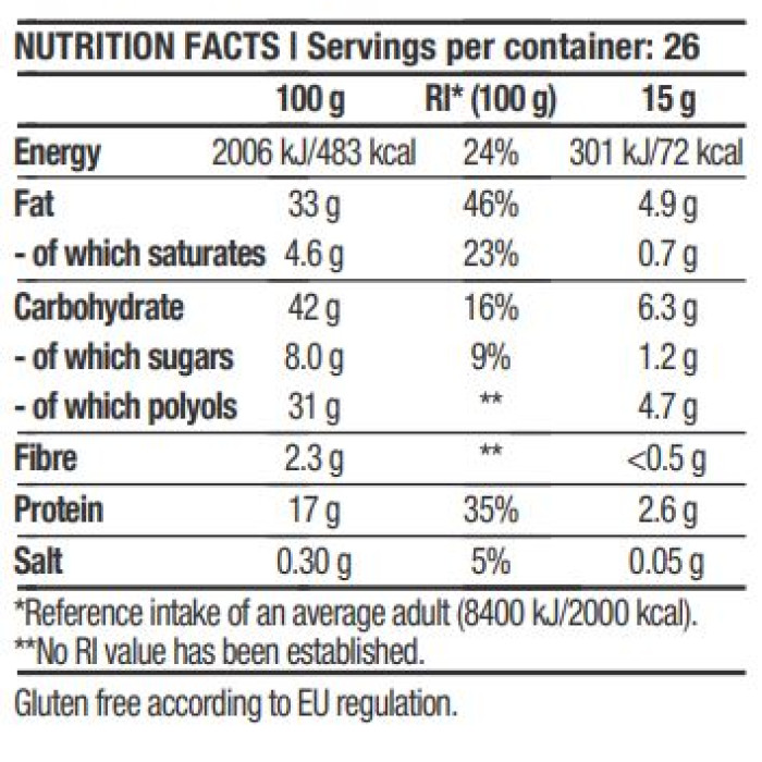BIOTECH USA Protein Cream е изключително вкусен и много полезен крем за мазане, който е перфектната алернатива на течните шоколади. Високото му съдържание на протеин и отсъствието на добавена захар, го правят идеалния десерт, когато имаш нужда от нещо сладко, но не искаш да нарушаваш диетата си. BIOTECH USA Protein Cream не съдържа палмово масло и консерванти. Подходящ е както за мазане на филийка, допълнение към протеиновите ти десерти или пък директна консумация. Една Доза: Според собствените нужди Начин на приемане: Според собствените нужди Дози в опаковка: Според собствените нужди Вземи още сега с гарантирано качество от Спортен склад БГ! Съставки: Подсладител (малтитоли), слънчогледово масло, концентрат на суроватъчен протеин (17%), печени лешници (10%), суроватка на прах (9%), какао на прах с намалено съдържание на мазнини (7%), емулгатор (лецитини), ароматизатори. Забележки: Пазете далеч от деца. Съхранявайте на сухо и хладно място. Да не се използва като заместител на разнообразното хранене. Прекомерната употреба може да има разхлабителен ефект. Поръчай сега от Спортен склад БГ BIOTECH USA Protein Cream с експресна доставка!