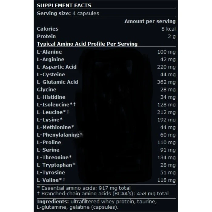 Една доза: 4 капсули Дози в опаковка: 41 Начин на употреба: Като хранителна добавка, приемайте 1-3 дози дневно, между храненията, веднага след тренировка и вечер, преди лягане. Съставки: ВСАА, л-аргинин, л-аланин, метионин, серин, тирозин, триптофан Забележки: Пазете далеч от деца! Съхранявайте на сухо и хладно място!