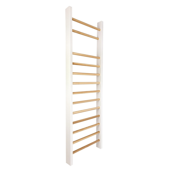 ЗДРАВА ДЪРВЕНА ИЗРАБОТКА Напречните греди са изработени от масивен бук, което е добър избор при уреди, които се използват редовно и поемат сериозно натоварване. Кръглата форма и диаметърът 3.5 см осигуряват удобен захват при висене, повдигане на крака и различни упражнения за гръб, корем и обща подвижност. Страничните рамки от бор допълват конструкцията с добра стабилност, а бялото лаково покритие стои чисто и подредено в домашна обстановка.