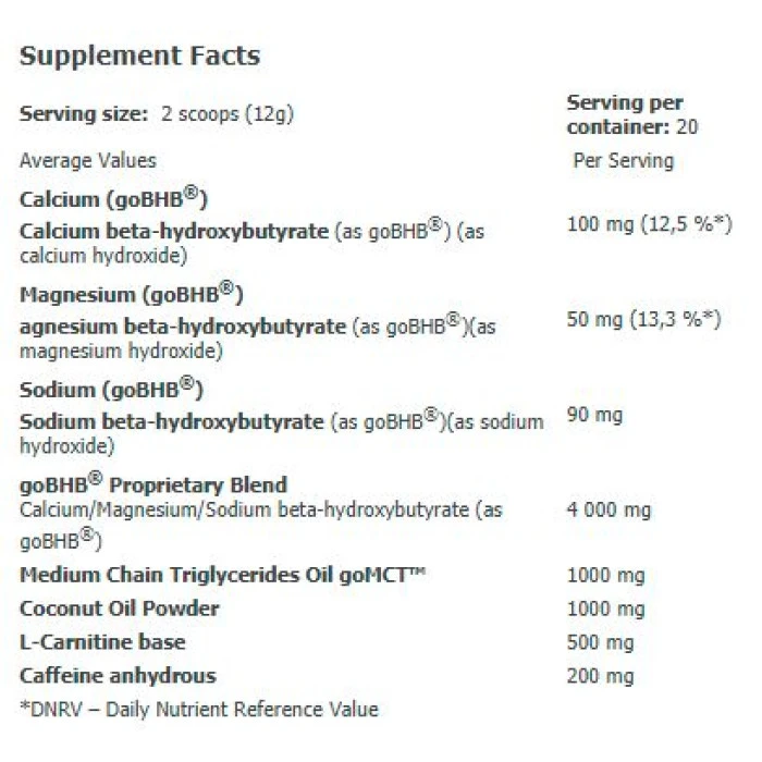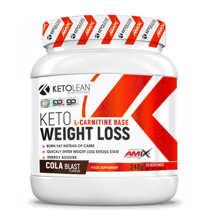 AMIX KetoLean® Keto Weight Loss е уникална хранителна добавка със специална смес от бета хидроксибутирати goBHB®, които помагат на тялото да достигне кетогенно състояние, средноверижни триглицериди goMCT ™ и кокосово масло на прах, за да подхрани тялото ви с допълнителни здравословни мазнини, както и L-карнитин, който подпомага изгарянето на мастните киселини. AMIX KetoLean® Keto Weight Loss намалява умората по време на тренировка, тъй като трансформира излишните мазнини в енергия, без да нарушава мускулната маса. Освен това подобрява възстановяването и предотвратява катаболния ефект. AMIX KetoLean® Keto Weight Loss е със страхотен осежаващ вкус на Кола и е специално формулиран за атлети на Кето режим. Една Доза: 2 мерителни лъжици (12 грама) Начин на приемане: Смесете една доза от продукта с 250мл вода и консумирайте веднъж дневено сутрин Дози в опаковка: 20 Вземи още сега с гарантирано качество от Спортен склад БГ! Съставки: Fibersol®-2 (устойчив на храносмилане малтодекстрин), средноверижно триглицеридно масло goMCT ™ (кокосово масло; овлажнител: смола акация; противослепващо средство: силициев диоксид), кокосово масло (рафинирано кокосово масло, малтодекстрин, млечен протеин, стабилизатор: натриев фосфат, антислепване агент: силициев диоксид), калциев бета-хидроксибутират (като калциев хидроксид / goBHB® /), магнезиев бета-хидроксибутират (като магнезиев хидроксид / goBHB® /), натриев бета-хидроксибутират (като натриев хидроксид / goBHB® /), l- карнитинова основа, регулатор на киселинността: лимонена киселина; безводен кофеин, аромат, противослепващ агент: силициев диоксид; подсладители: сукралоза и ацесулфам-К; емулгатор: соев лецитин; багрило: карамел Забележки: Пазете далеч от деца. Съхранявайте на сухо и хладно място. Да не се използва като заместител на разнообразното хранене. Поръчай сега от Спортен склад БГ AMIX KetoLean® Keto Weight Loss с експресна доставка!