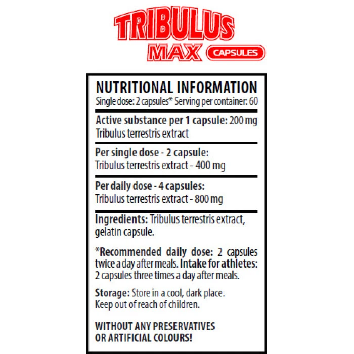 Разфасовки: 120 капсули. Tribulus Max от CVETITA HERBAL съдържа екстракт от Трибулус на капсули. Формулата има огромен потенциал при спортуващите хора, тъй като влияе положително върху резултатите от физическите усилия – насърчава мускулния растеж, подпомага мастния метаболизъм, увеличава силата и издръжливостта. Много широко е приложението на Бабини зъби и при проблеми с еректилната функция и либидото. Стероидните сапонини, които са активната съставка в извлека от билката, са отговорни за стимулиране на тестостероновите нива, но само при мъжете. При дамите се повишават типично женските хормони, които помагат при тежък ПМС и ниско сексуално желание. Предимства и ефекти: