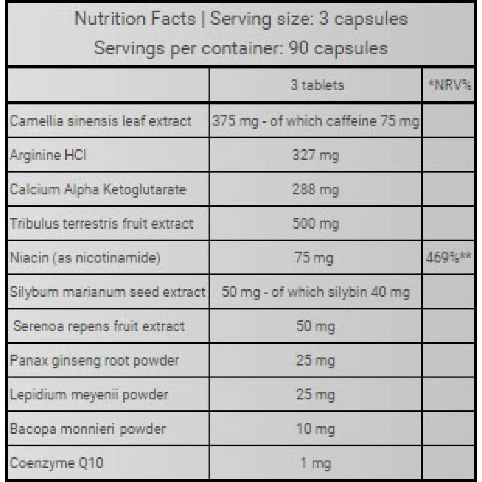 Съставки: Билкова бленда (Бабини зъби, екстракт от Camellia Sinensis лист, Serenoa екстракт, бял трън екстракт от семена, Panax женшен корен на прах, мака на прах, Bacopa monnieri прах), буфериран креатин монохидрат, капсулата [желатин, пречистена вода, цветове (титанов диоксид, брилянтно синьо FCF, Понсо 4R *)], Аргинин HCl, калций Алфа Кетоглутарат, ниацин (като никотинамид), анти-слепващи агенти (магнезиев стеарат, силициев диоксид), Коензим Q10.