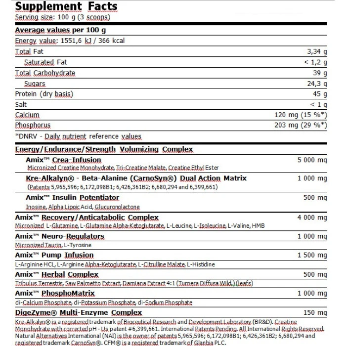 Основата се състои от висококачествена смес от протеини, въглехидрати и изключителен „Пакет” от високо стойностни компоненти (креатин монохидрат, Kre-Alkalyn, CEE (Креатин етил естер), L-глутамин, L-аргинин - AKG (аргинин кетоглутарат), верижно-разклонени аминокиселини - BCAA, Tribulus Terrestris, екстракт от Guggul, …) за поддържане на експлозивния анаболен ефект на продукта. Ако нямате желание да губите време в търсене на необходимата и ефективна комбинация от хранителни добавки, сред множеството предлагани на пазара, заложете на Amix Anabolic Masster. Това е един отличен избор - „Всичко в едно”, съдържащ комбинация от високоефективни, качествени, необработени суровини. Протеиновата смес на продукта специално комбинира суроватъчен протеин концентрат, аминокиселини, извлечени от говежди протеин, два вида суроватъчни изолати, произведени посредством CFM метод (микрофилтрация в кръстосани потоци) и уникален процес на йонообмен - йонна обмяна. В отличния спектър от аминокиселини, съдържащ се в Amix Anabolic Masster, се открояват тези от хидролизиран суроватъчен протеин и яйчен албумин. Amix Anabolic Masster също така притежава уникален състав от висококачествени въглехидрати с голям енергиен потенциал и способността да пренасят креатина бързо и ефикасно до мускулите. Вкусове: