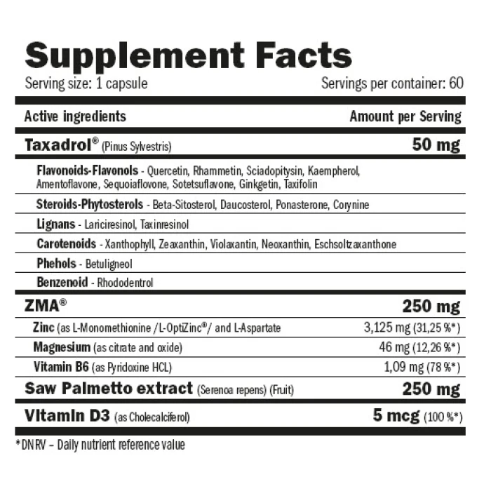 Хранителната добавка съдържа екстракт от бял бор, който е натурален стимулатор на тестостероновия синтез. Оказва благоприятен ефект върху силата, издръжливостта, мускулите и либидото.