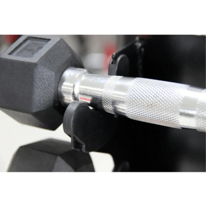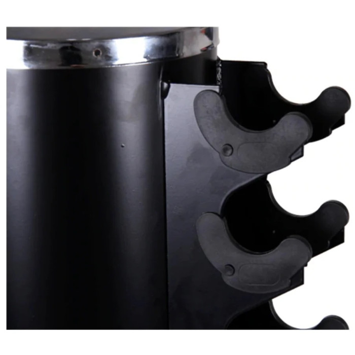 СТАБИЛНА СТОМАНЕНА ИЗРАБОТКА Стойката е изработена от стомана и е завършена с черно епоксидно покритие, което е подходящо за редовна употреба и по-добра устойчивост на следи от работа. Черният финиш в комбинация с хромирания капак ѝ придава по-завършен и изчистен вид, така че освен практична, стойката стои добре и визуално в подреден фитнес кът.