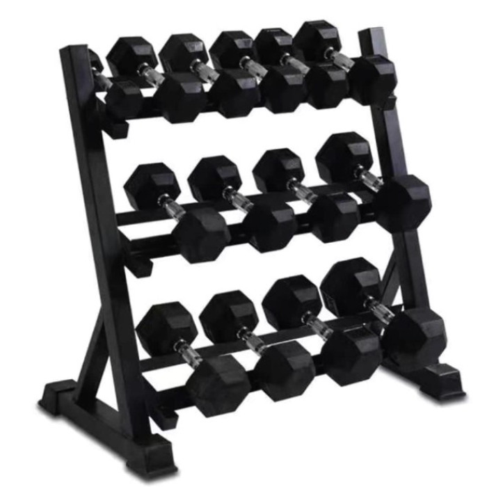 КОМПАКТНА И ЗДРАВА ОРГАНИЗАЦИЯ ЗА ДЪМБЕЛИ Тази стойка за дъмбели е направена за хора, които искат подреден и удобен тренировъчен кът, без тежестите да стоят разхвърляни по пода. Тристепенната конструкция позволява дъмбелите да бъдат подредени ясно и да се вземат бързо по време на тренировка. Наклоненият дизайн улеснява достъпа до всяко ниво и прави стойката практична както за домашен фитнес, така и за по-интензивна ежедневна употреба.