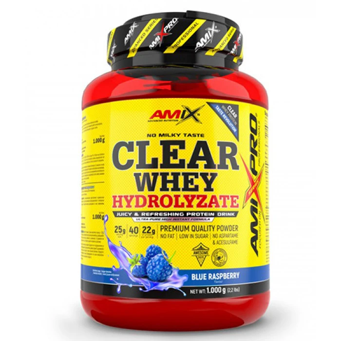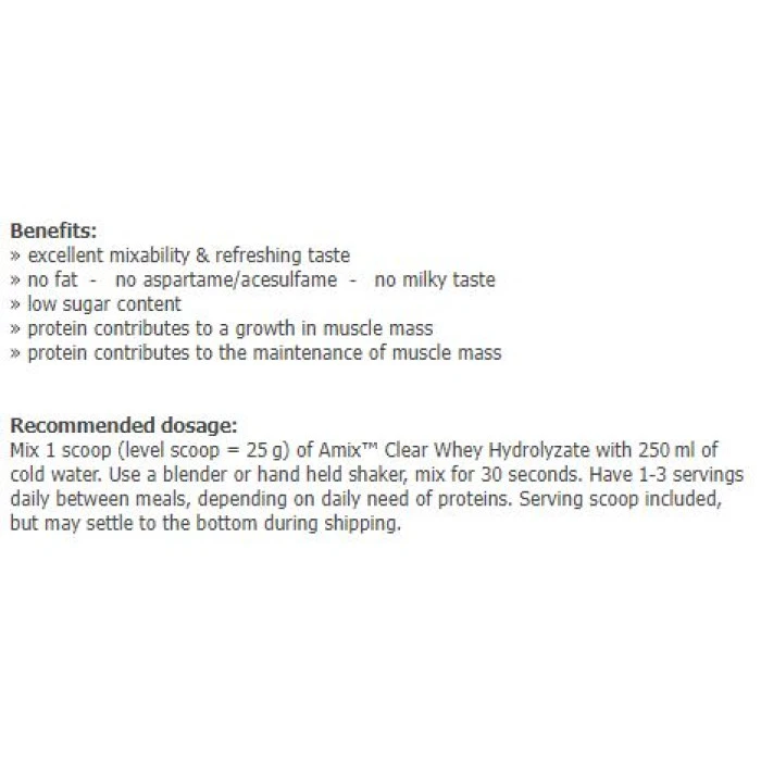 AMIX AmixPro® Clear Whey Hydrolyzate е висококачествен, изцяло прозрачен суроватъчен протеин хидролизат, който доставя на тялото всички необходими хранителни вещества за бързо възстановяване и качване на чиста мускулна маса. AMIX AmixPro® Clear Whey Hydrolyzate е изключително лесен за разтваряне и се абсорбира максимално от тялото. Освен това е без добавени мазнини и захар. Не съдържа аспартам и ацесулфам.
