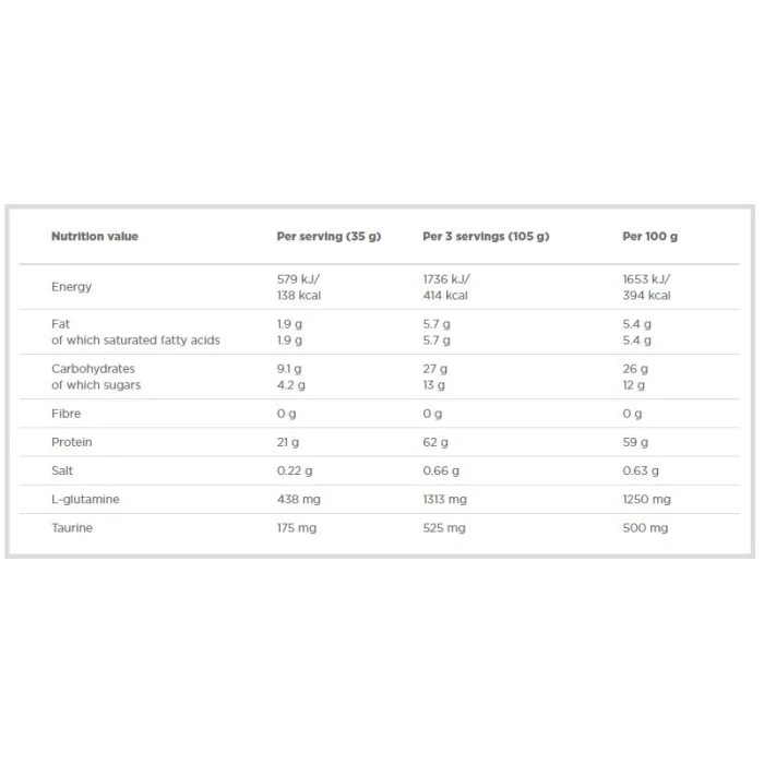 Достатъчното количество аминокиселини е изключително важно за възстановяване на мускулната тъкан след интензивна тренировка. Суроватъчния протеин в Pro Whey Shakeима високо съдържание на аминокиселини с разклонена верига (левцин, исолевцин и валин), които са незаменими и играят ключова роля за изграждането на мускулите. Също така, формулата е обогатена с глутамин в свободна форма. Изолатът и хидролизатът са познати с изключително бързото си усвояване. Това е много важно когато приемате протеинова пудра след тренировка, която да стартира процеса на възстановяване и растеж. Не е важно какво давате на тялото си, но и кога. В тези две отношения Pro Whey Shake е просто перфектен. Една доза =35 грама (1 мерителна лъжица) Начин на приемане:Приемайте до 3 дози дневно. Дози в опаковка:64 Вкусове: Ванилия Шоколад Ягода Доверете се на OLIMP и изберете най-добрия протеин – Pro Whey Shake! Съставки: Ултрафилтриран суроватъчен протеин концентрат;малтодекстрин; ксантанова смола;натриева карбоксиметил целулоза; L-глутамин;средноверижни мастни киселини (МСТ масло); таурин; царевично нишесте;изомалтулоза ;фруктоза; ацесулфам К; сукралоза;цикламати;регулатор на киселинността - калиев хлорид; емулгатор - соев лецитин; оцветители. Забележки: Не превишавайте препоръчителния дневен прием! Да не се използва като заместител на разнообразното хранене! Поръчай сега от Спортен склад БГ OLIMP Pro Whey Shake с експресна доставка!