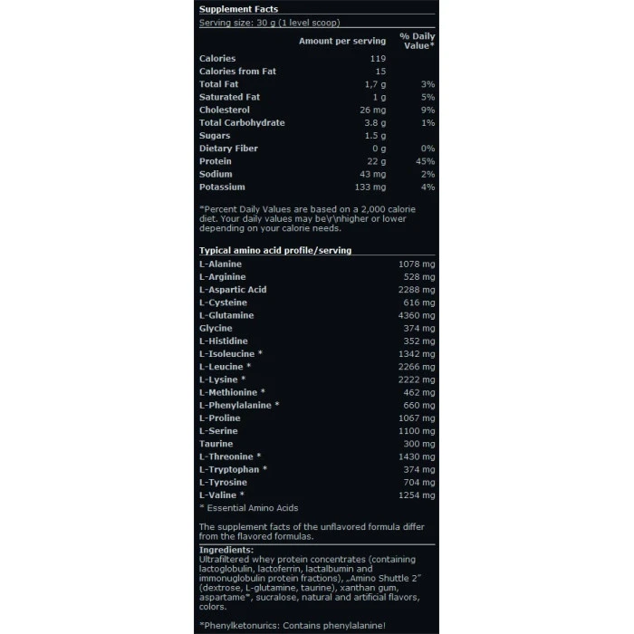 Богатият аминокиселинен профил на продукта се състои от 47,5% от най-анаболните аминокиселини – ВСАА, аргинин, глутамин и тирозин, като в същото време съдържа нисък процент лактоза.