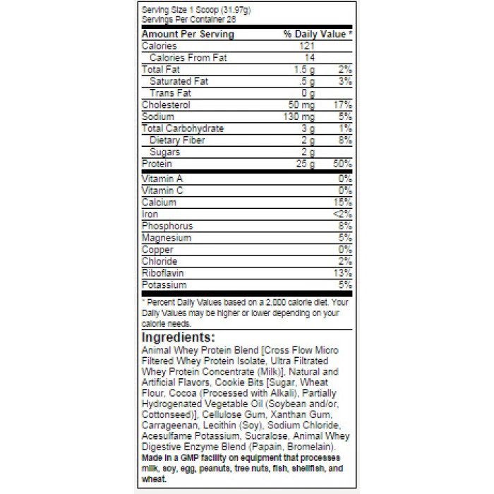 Animal Whey е комплексен протеинов продукт, съдържащ суроватъчни източници. С всяка доза той осигурява оптимално количество белтъчини за мускулно изграждане. Суроватъчният протеин е пълноценен източник на всички есенциални аминокиселини, които са важни за спортните резултати и здравето. Суплементът не само ще Ви помогне да повишите протеиновия си прием за деня и ще ви изведе на следващото ниво в тренировките. Малкото количество калории прави добавката чудесна за включване в режим за намаляване на мазнините. Начин на употреба: Разтворете 1-2 дози (32-64 г) в 250-350 мл нискомаслено мляко или вода. Приемайте веднага след ставане и след тренировка. Дози в опаковка: 28 / 54 (в зависимост от разфасовката) Съставки: Animal Whey Protein Blend [Cross Flow Micro Filtered Whey Protein Isolate, Ultra Filtrated Whey Protein Concentrate (Milk)], Cocoa (Processed with Alkali), Natural and Artificial Flavors, Cellulose Gum, Xanthan Gum, Carrageenan, Lecithin (Soy), Sodium Chloride, Acesulfame Potassium, Sucralose, Animal Whey Digestive Enzyme Blend (Papain, Bromelain). Забележки: Не превишавайте препоръчителната дневна порция! Да не се използва като заместител на балансираното хранене!