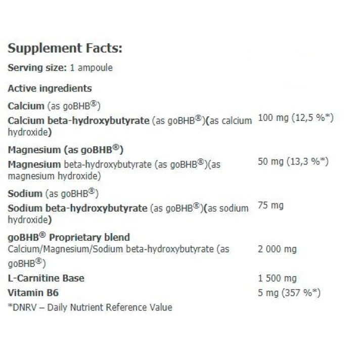 Състав: Пречистена вода, l-карнитин база, съединения на бета-хидроксибутират (goBHB®), регулатор на киселинността, консерванти, аромати, витамин B6 и други.