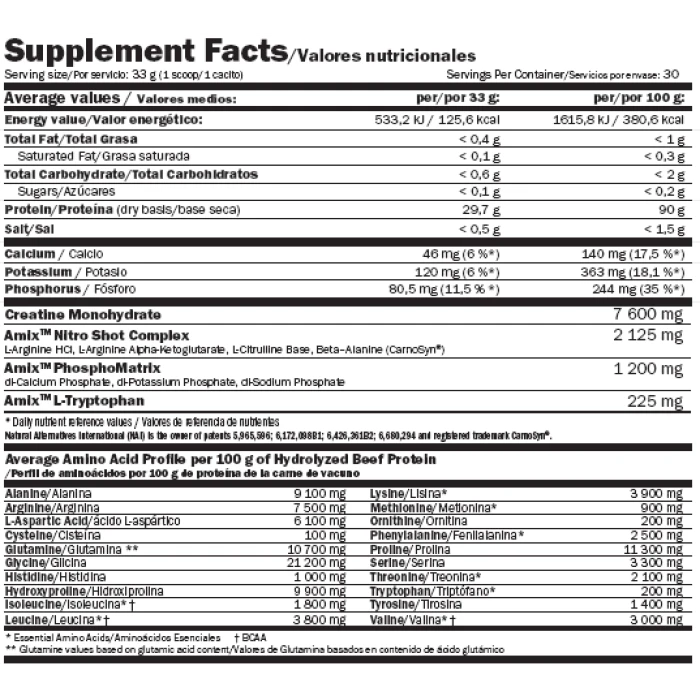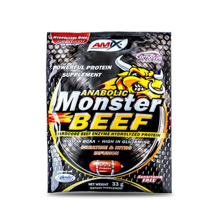 Monster Beef от Amix съдържа 90% хидролизиран говежди протеин, който е един от най-пълноценните източници на белтъчини на пазара. Ензимната хидролиза намалява времето, което е нужно за предварително разграждане на протеините и извличане на съдържащите се аминокиселини. Друга важна съставка в продукта е креатин монохидрат, който е нужен за възстановяване на енергийните нива. Amix Monster Beef съдържа също така Nitro Shot Комплекс, състоящ се от подобряващи кръвообращението вещества, осигурявайки по-бързо и директно хранене на мускулите. Като допълнение, продуктът предоставя PhosphoMatrix, снабдяваща с всички нужни минерали, които са от особено значение за тялото на спортуващия човек. Предимства при употребата: