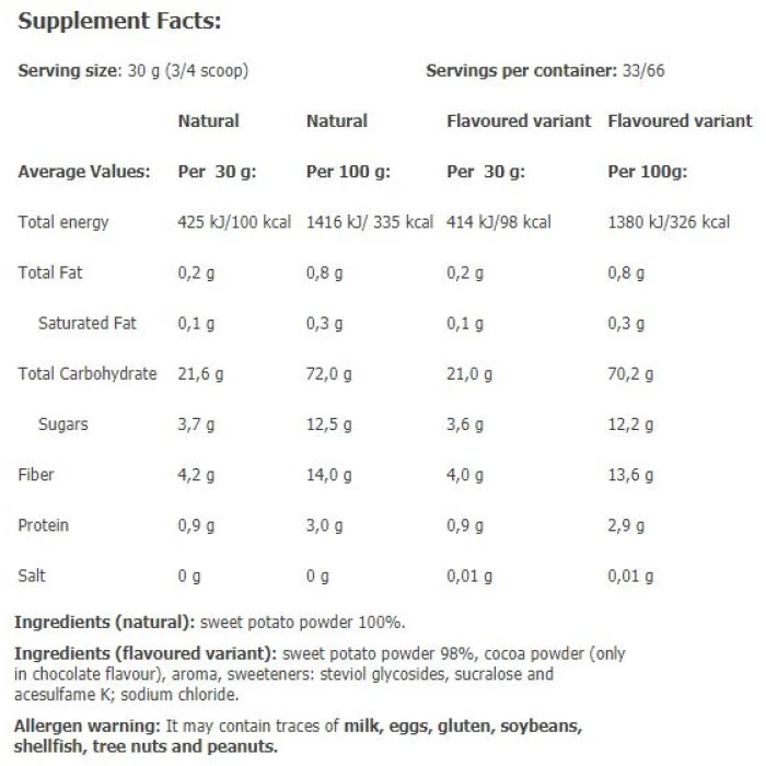AMIX Sweet Potato Clean Carbs е уникална и висококачествена въглехидратна пудра от сладки картофи. Богата на сложни въглехидрати и фибри, които не повишават рязко нивата на кръвна захар и подпомагат храносмилането и перисталтиката. Сладките картофи са хранителна бомба и съдържат високи дози витамин А, С и B6, както и манган, калий и мед. Подсилват имунната система и могат да намалят риска от хронични заболявания. AMIX Sweet Potato Clean Carbs е напълно натурален продукт, който ще задоволи енергийните нужди на вашето тяло и ще Ви презареди, за да сте готови за следващата натоварваща тренировка! Ако обичате да експериментирате в кухнята, пудрата може да се използва и в разнообразни готварски рецепти. Вкусове: