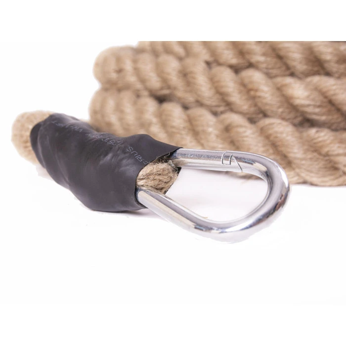 Горният край е снабден с предпазен капак и карабинер за окачване, което улеснява монтажа и прави използването по-практично. Долният край е осигурен против разплитане, което е важен детайл за по-дълъг живот на въжето и по-поддържан вид при честа употреба.