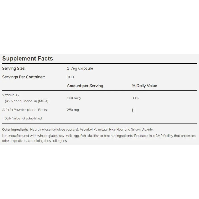 Съставки: Витамин С (от Аскорбил Палмитат), Витамин К2 (като Менахинон-4), люцерна - прах.