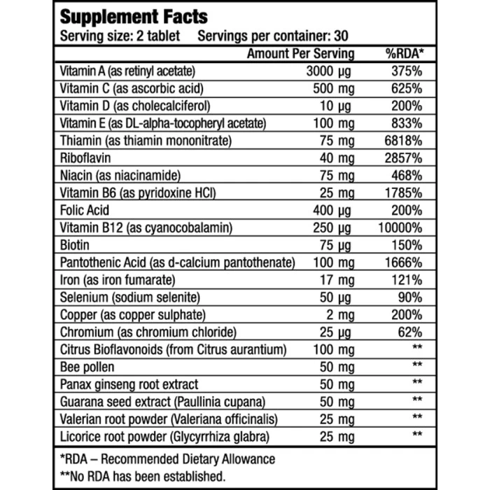 Сложна витаминно-минерална формула за стимулиране изработването от организма на енергия и метаболични процеси. Способства за храносмилането, разграждането на въглехидрати, мазнини и протеини. Усилва образуването на кръв, подобрява препредаването на нервните импулси. За сметка на енергостимулиращите агенти, лечебните растения способстват за поддържането на добро самочувствие. Високо съдържание на активни вещества. Хранителна добавка, съставена от 12 различни витамини, 4 разновидности на минерални вещества, екстракти от лечебни растения. Една доза: 2 капсули Дози в опаковка: 30 Начин на употреба: Приемайте по 1 доза дневно Съставки: витамин С, витамин А, витамин Е, витамин D, тиамин, ниацин, фолиева киселина, витамин В6, витамин В12, желязо, селен, хром, пчелен прашец, цитрусови биофлавоноиди, валериан - екстракт, гуарана - екстракт Забележки: Пазете далеч от деца! Съхранявайте на сухо и хладно място! Поръчай сега от Спортен склад БГ BIOTECH USA Vitamin B-Complex 60 Tabs. с експресна доставка! Дозировка: 2 таблетки Брой дози в опаковка: 30 Употреба: Приемат се по 2 таблетки на ден.