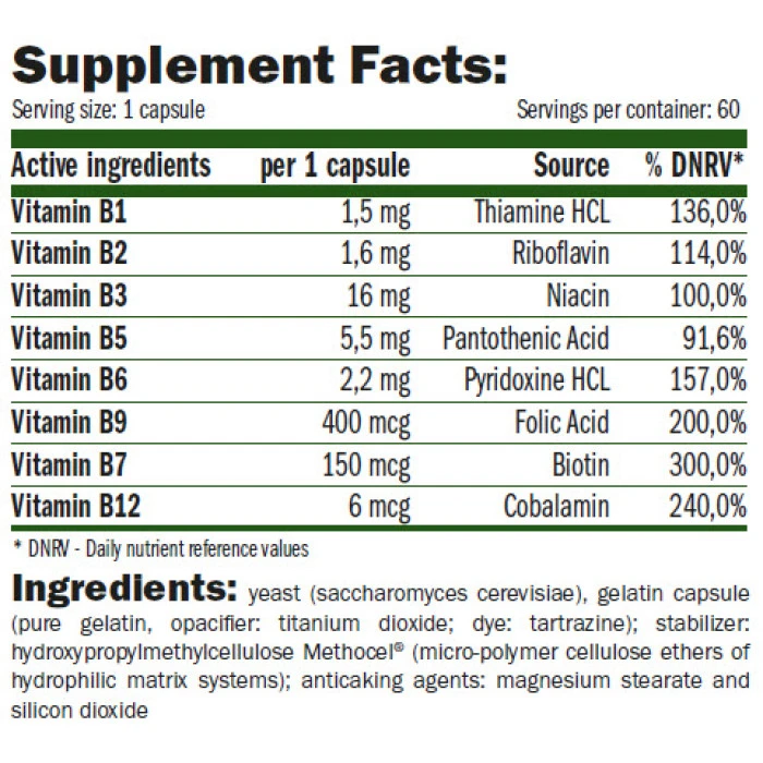 Съставки: Витамин В1, Витамин В2, Витамин В3, Витамин В12.