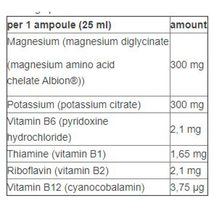 Хранителна добавка, под формата на ампула, която съдържа висококачествена комбинация от Магнезий и Витамин В6. Функции и характеристики: