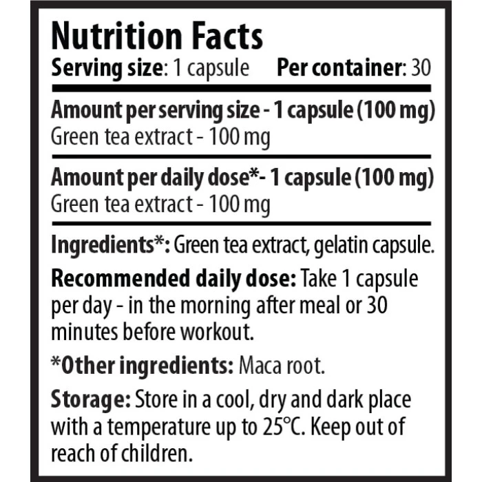 Употребата на Зелен Чай стимулира произвеждането на хормона норадреналин, който пък помага за бързото изгаряне на калории. Освен това, зеления чай е богат на полифеноли, които разтварят триглицерините в черния ни дроб и тънките черва и така, той води до намаляване на теглото и телесните мазнини. Една доза: 1 капсула Дози в опаковка: 30 Начин на употреба: Приемайте по 1 доза дневно - сутрин със закуската или 30 минути преди тренировка Съставки: зелен чай Забележки: Пазете далеч от деца! Съхранявайте на сухо и хладно място! Поръчай сега от Спортен склад БГ CVETITA HERBAL Green Tea 100mg. / 30 Caps. с експресна доставка!