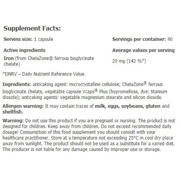 AMIX ChelaZone® IronChel® е хранителна добавка с уникална формула, базирана на железен бисглицинат хелат. Една от най-добрите и лесно усвоими форми на желязо – само и единствено високо качество за вашето здраве. Идва в капсули с растителен произход, което прави продукта подходящ за вегани и вегетарианци. AMIX ChelaZone® IronChel® е натурален продукт, който чрез своето бързо и ефикасно усвояване доставя на тялото нужния дневен прием! Желязото е един от най-важните минерали и участва в редица процеси в човешкото тяло. Участва в производството на енергия, червени кръвни телца и хемоглобин. Тези му свойства се борят ефективно с умората и предотвратяват пълното изтощение. Подпомага също нормалното транспортиране на кислород в кръвта. Засилва имунната система и подобрява когнитивната дейност. Една доза: 1 капсула Дози в опаковка: 90 Начин на приемане: Приемайте 1-2 дози на ден с храна и вода Съставки: антислепващо средство: микрокристална целулоза; ChelaZone® железен бисглицинат хелат, растителна капсула Vcaps® Plus (хипромелоза, багрило: титанов диоксид); средства против слепване: растителен магнезиев стеарат и силициев диоксид. Забележки: Не превишавайте препоръчителния дневен прием! Не използвайте като заместител на разнообразното хранене! Cъxpaнявaйтe нa cyxo и xлaднo мяcтo! Поръчай сега от Спортен склад БГ AMIX ChelaZone® IronChel® Iron / Ferrous/ Bisglycinate Chelate / 90 Vcaps с експресна доставка!